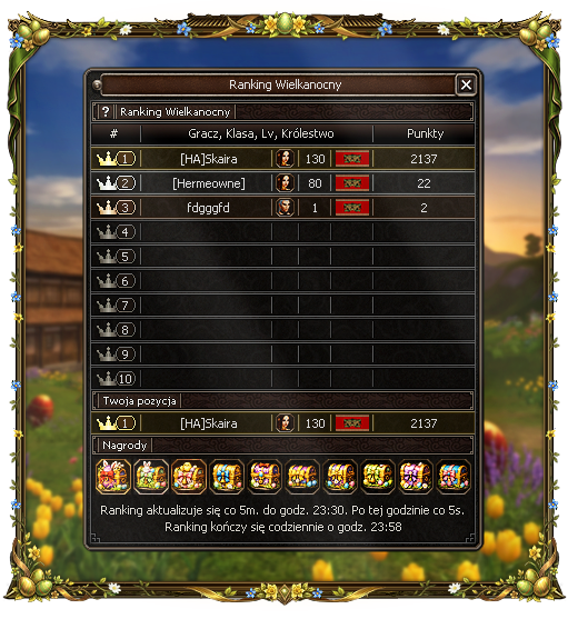 Punkty zdobywacie poprzez oddawanie Magicznego Jajka (dostępne u Zająca Wielkanocnego). Każdy przekazany przedmiot zwiększa Wasz wynik — a im wyższy wynik, tym bliżej szczytu zestawienia.